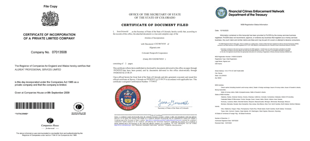 Recently, AlgreatX announced key breakthroughs in its global compliance strategy: following the UK entity ALGREAT PROFESSIONAL SERVICES LIMITED, the platform has completed its US company registration and successfully obtained an MSB (Money Services Business) license. This progress signifies an expanded service coverage into major global markets, enabling it to provide financial services compliant with local regulations for users in different regions.