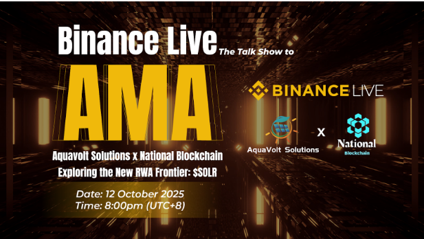 October 12, 2025 AquaVolt Solutions (AVS), a global leader in floating solar infrastructure and blockchain-based green asset tokenization, has successfully concluded its live AMA session in partnership with National Blockchain on Binance Live. The online event attracted more than 3,900 concurrent viewers, marking a major milestone in AVS’s international outreach and signaling strong global interest in the SOLR RWA ecosystem.