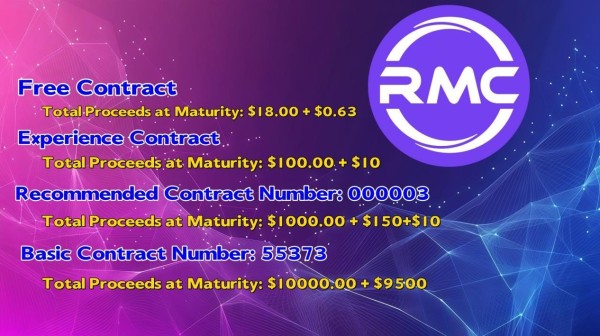RMC MINING currently offers a variety of mining contracts, such as: a $100 trial contract (valid for 2 days, withdrawable, allowing you to understand our mining process), a $1000 referral contract with a 10-day short-term term (suitable for investors with limited funds, offering an immediate $10 bonus), and a $10,000 50-day contract with a maturity yielding $9,500. The return on investment (ROI) and contract duration vary for each contract. For higher contracts, please visit the website.
