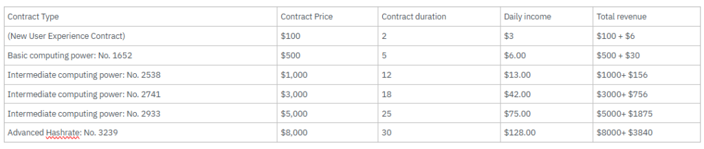 The platform offers a variety of contracts, from small trials to large VIP packages, suitable for beginners, ordinary investors, and institutional users.