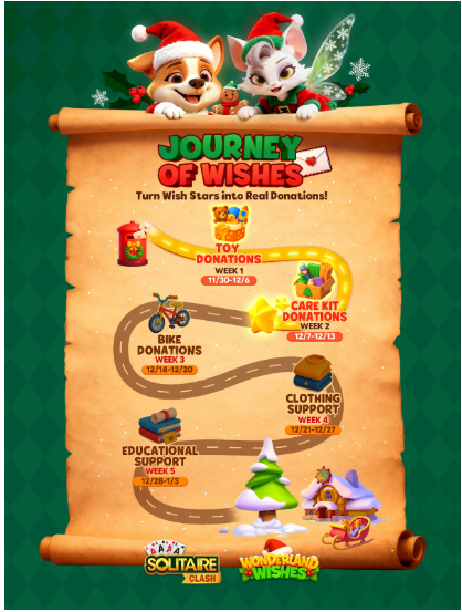 Launched on November 30, Wonderland Wishes invites Solitaire Clash players to take part in a new charitable theme each week throughout the holiday season. Each themed week highlights a different way to support youth connected to Foster Love.