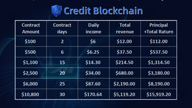 • Extremely Low Barrier to Entry and Risk: No need to purchase expensive mining equipment, or bear high electricity and maintenance costs. CreditBlockchain has solved all the technical challenges for you; you can easily get started with a simple investment.