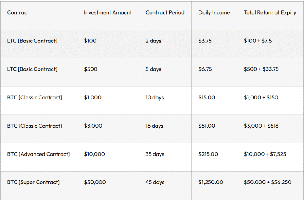 - No Equipment Needed: Users do not need to buy expensive crypto mining hardware; simply sign a contract and receive profits every 24 hours.