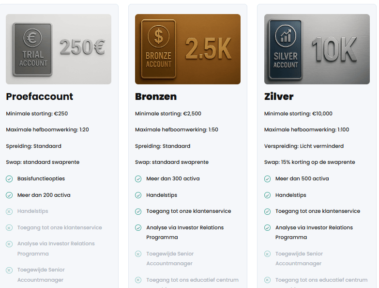 - Bronzen Account: Met een minimale storting van €2.500 biedt het Bronzen account hefboomwerking tot 1:50 en standaard spreads. Handelaren krijgen toegang tot meer dan 300 activa, klantenservice en marktanalyses via het Investor Relations Programma.