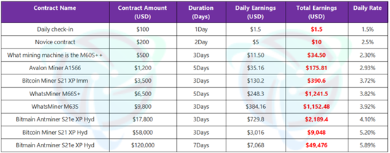 2. Choose a mining contract: The platform offers multiple high-performance, high-yield cloud computing plans. These contracts generate corresponding returns based on hashrate scale and duration.