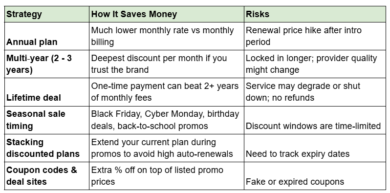 Many providers push 1 to 3-year plans with deep introductory discounts that are 2 to 3 times cheaper per month than paying month to month. The catch is that auto-renewals often happen at the full, undiscounted price if you do not cancel or switch in time.