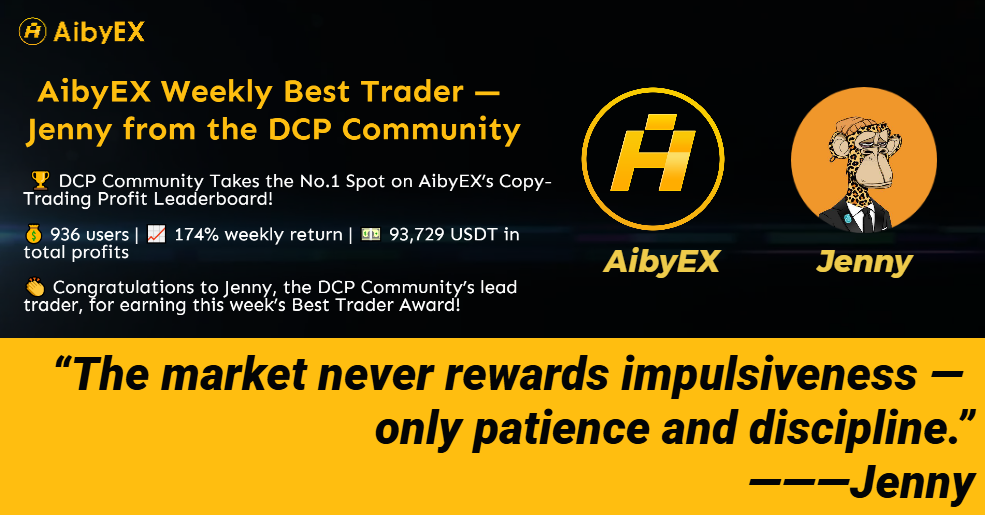 At the same time, Jenny, the top trader from the DCP Community, has been honored with the title of AibyEX Weekly Best Trader.”