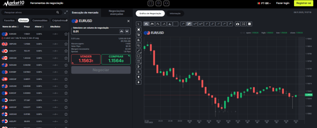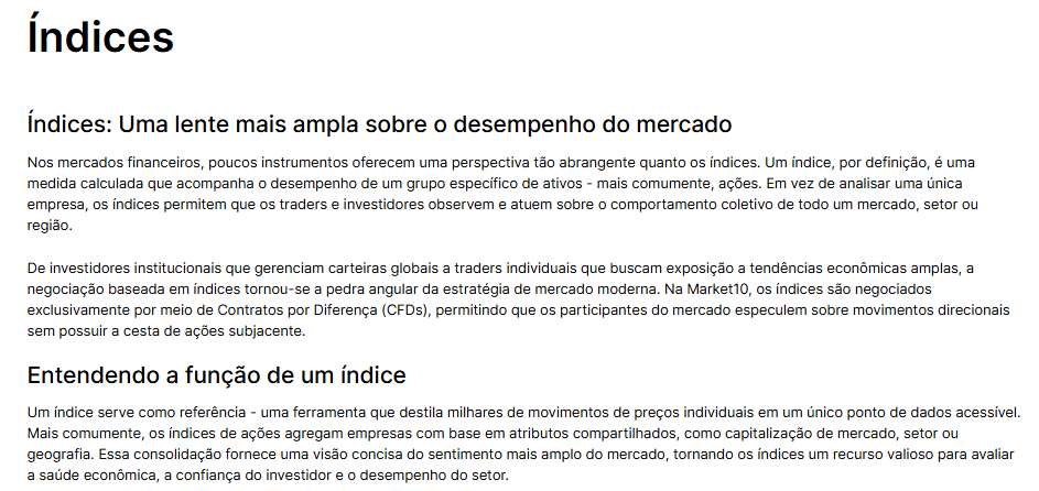 O Market10.net oferece CFDs sobre vários ativos, incluindo índices globais, moedas e commodities, permitindo que traders aproveitem os movimentos de preços sem precisar possuir os ativos subjacentes.