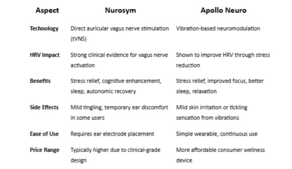 Vagus nerve stimulation has become a leading method for improving stress resilience, heart rate variability (HRV), and overall well-being. Two of the most popular devices in this category are Nurosym and Apollo Neuro. While both aim to balance the nervous system and enhance mental and physical health, they differ in technology, applications, and price points. This comparison explores the key differences between Nurosym and Apollo Neuro, helping readers make an informed choice.