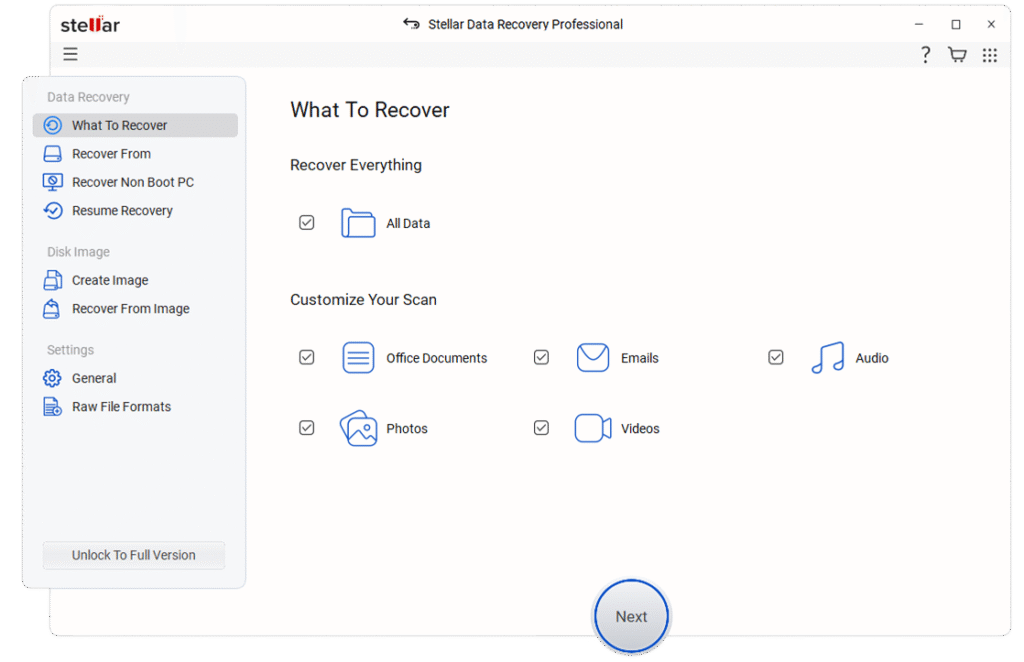 Recovering data with Stellar is simple. After downloading the free demo version of Stellar, launch the program and select the type of data you wish to restore documents, photos, videos, or emails.