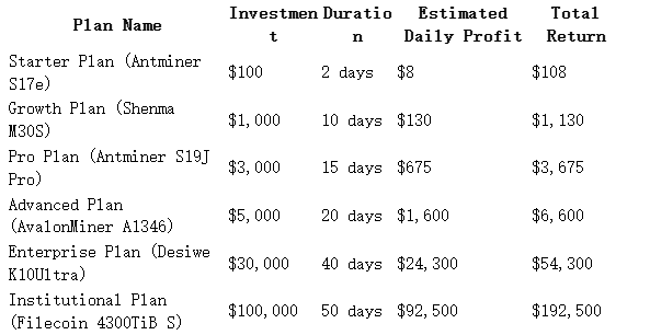 WinnerMining offers a range of contracts for different investment goals. New users receive a $15 welcome bonus, and payouts are distributed daily.